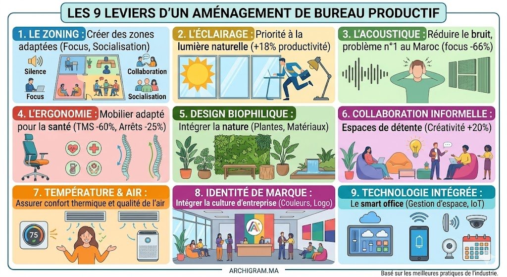 Voici les neuf axes sur lesquels intervenir pour transformer un plateau de bureaux standard en espace de performance. Ils sont classés par impact décroissant sur la productivité, d’après notre expérience en aménagement de bureaux au Maroc.