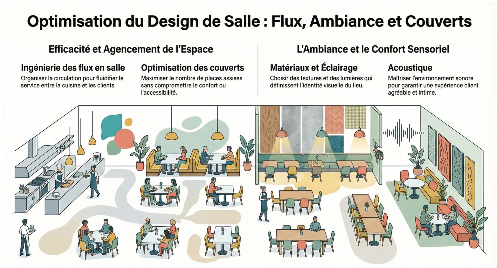 Chaque m² de salle doit être rentabilisé. La règle standard est de 1,2 à 1,5 m² par couvert (table + chaise + circulation). Un restaurant de 80 m² de salle peut donc accueillir 55 à 65 couverts — à condition que le plan d’implantation soit optimisé. Les banquettes murales, les tables modulables et les zones de bar permettent de gagner 10 à 15 % de couverts supplémentaires sans sacrifier le confort.