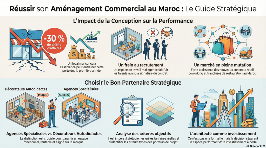 Un local commercial mal conçu à Casablanca peut faire perdre jusqu’à 30 % de chiffre d’affaires dès la première année. Un bureau mal agencé fait fuir les talents avant même qu’ils ne signent leur contrat. Le choix de votre architecte d’intérieur n’est pas une formalité — c’est la décision qui sépare un espace qui performe d’un investissement à perte.