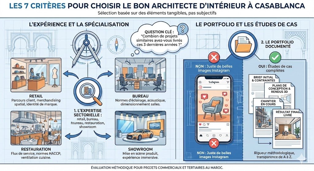 Tous les architectes d’intérieur ne maîtrisent pas les mêmes typologies de projets. Un professionnel qui excelle dans les appartements de luxe à Marrakech ne possède pas nécessairement les compétences requises pour concevoir un showroom automobile à Casablanca ou un concept de restauration rapide à Rabat.