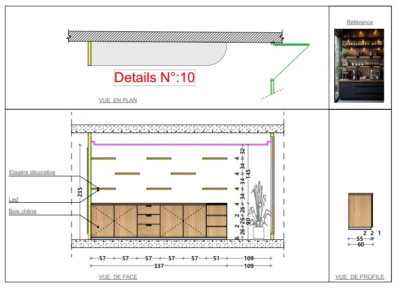 • La Kitchenette et les Sanitaires sont modernes et équipés, en continuité avec l’esthétique épurée du projet.
