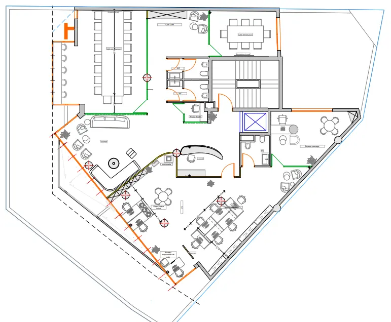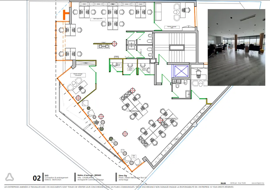 Le réaménagement du siège social de Brinks Maroc vise à moderniser l’espace de travail pour mieux répondre aux enjeux actuels. Brinks, acteur majeur de la sécurité et du transport de fonds, souhaite un siège reflétant ses valeurs de fiabilité et de sécurité, tout en intégrant des solutions innovantes pour améliorer le bien-être de ses employés.