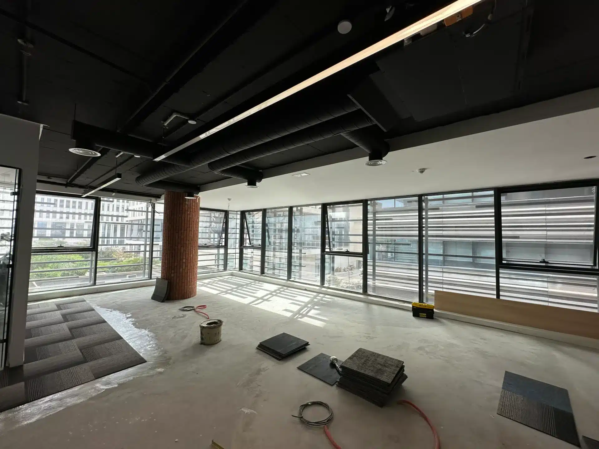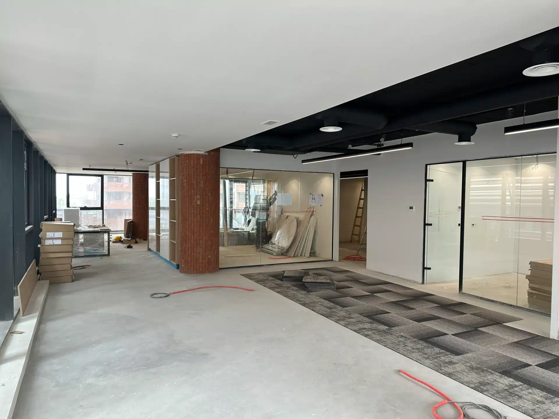 Les équipes étaient mobilisées sur site pour le pilotage des corps d’état, l’installation des systèmes techniques et la préparation des habillages (briques et bois), assurant ainsi la transformation de l’espace brut en conformité avec le concept industriel-chic.