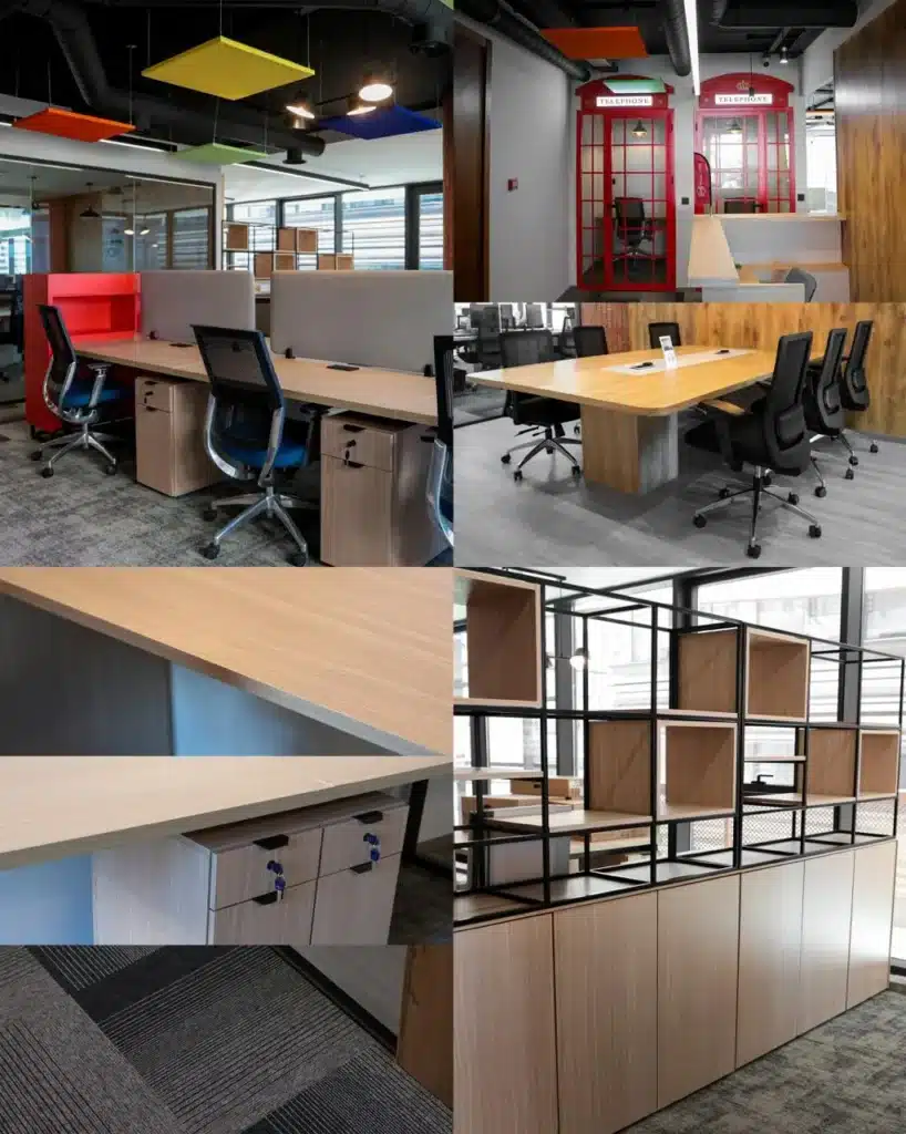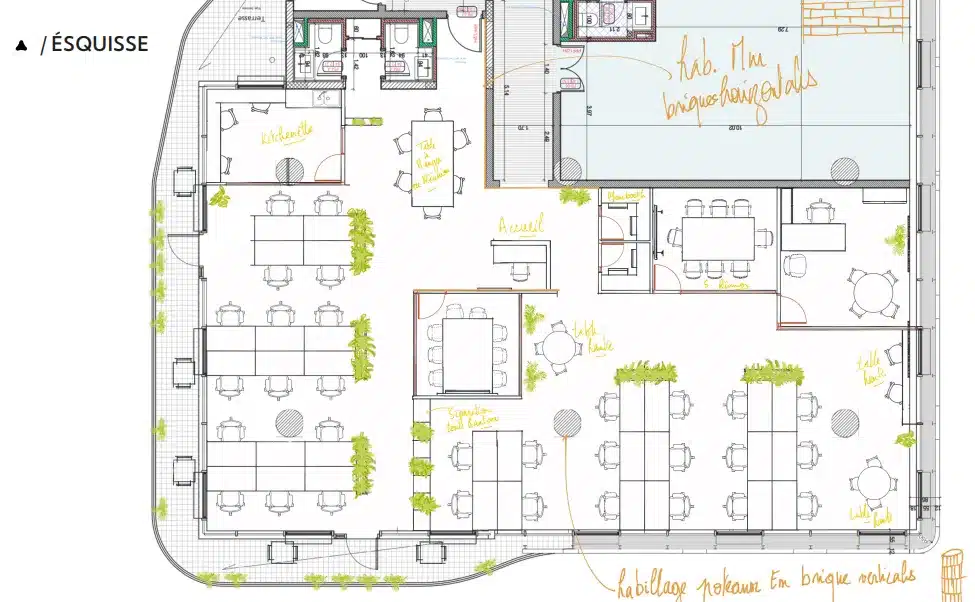 - Végétalisation (“Vert + Végétal”) : Intégration massive de plantes pour créer des séparations naturelles et améliorer la qualité de l’environnement de travail.