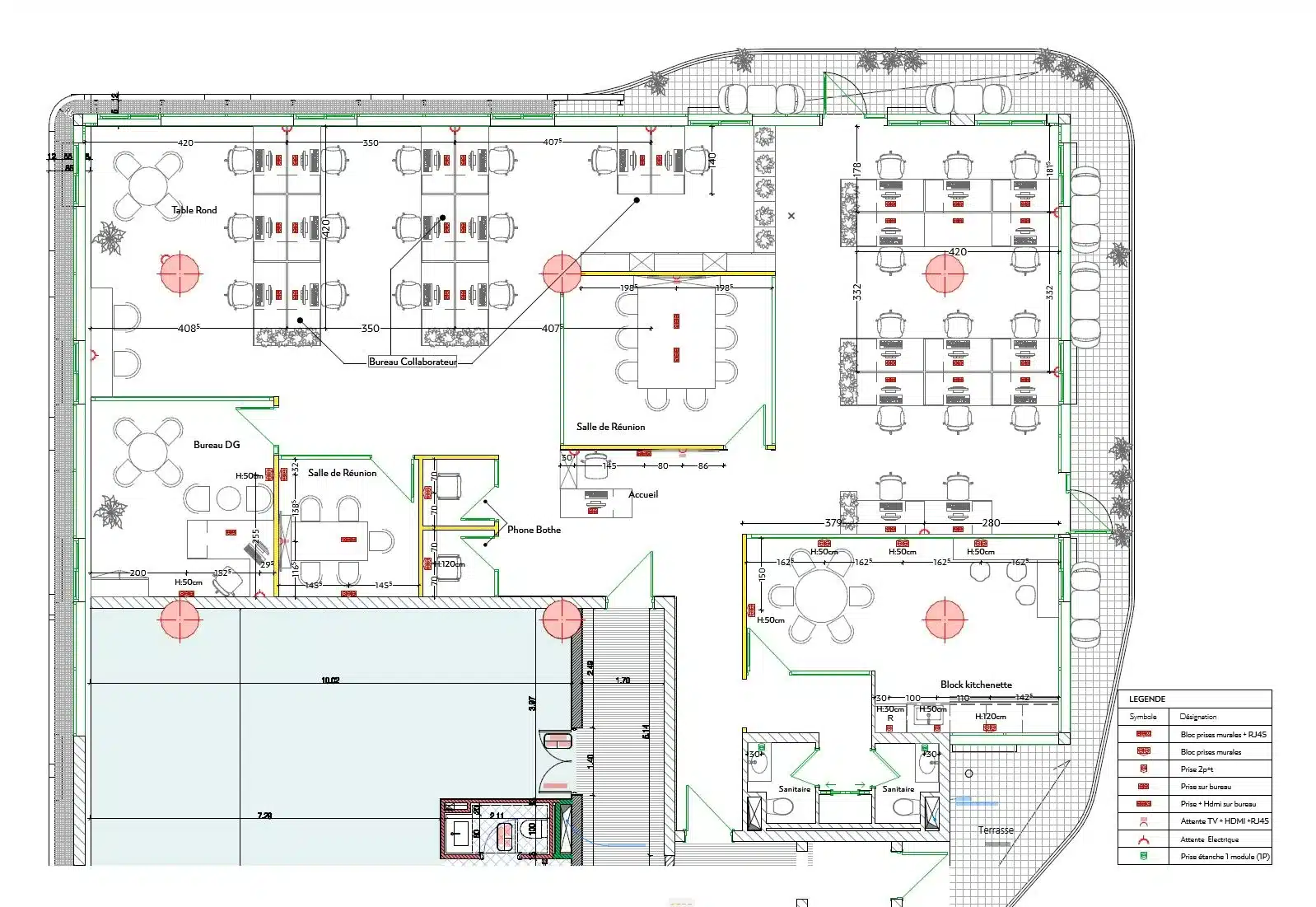 - Diversité des Postes : postes de travail classiques, tables hautes informelles, coin détente/tisanerie (Kitchenette ), et une terrasse , permettant aux employés de choisir l’environnement le plus adapté à leurs tâches et favorisant la créativité.