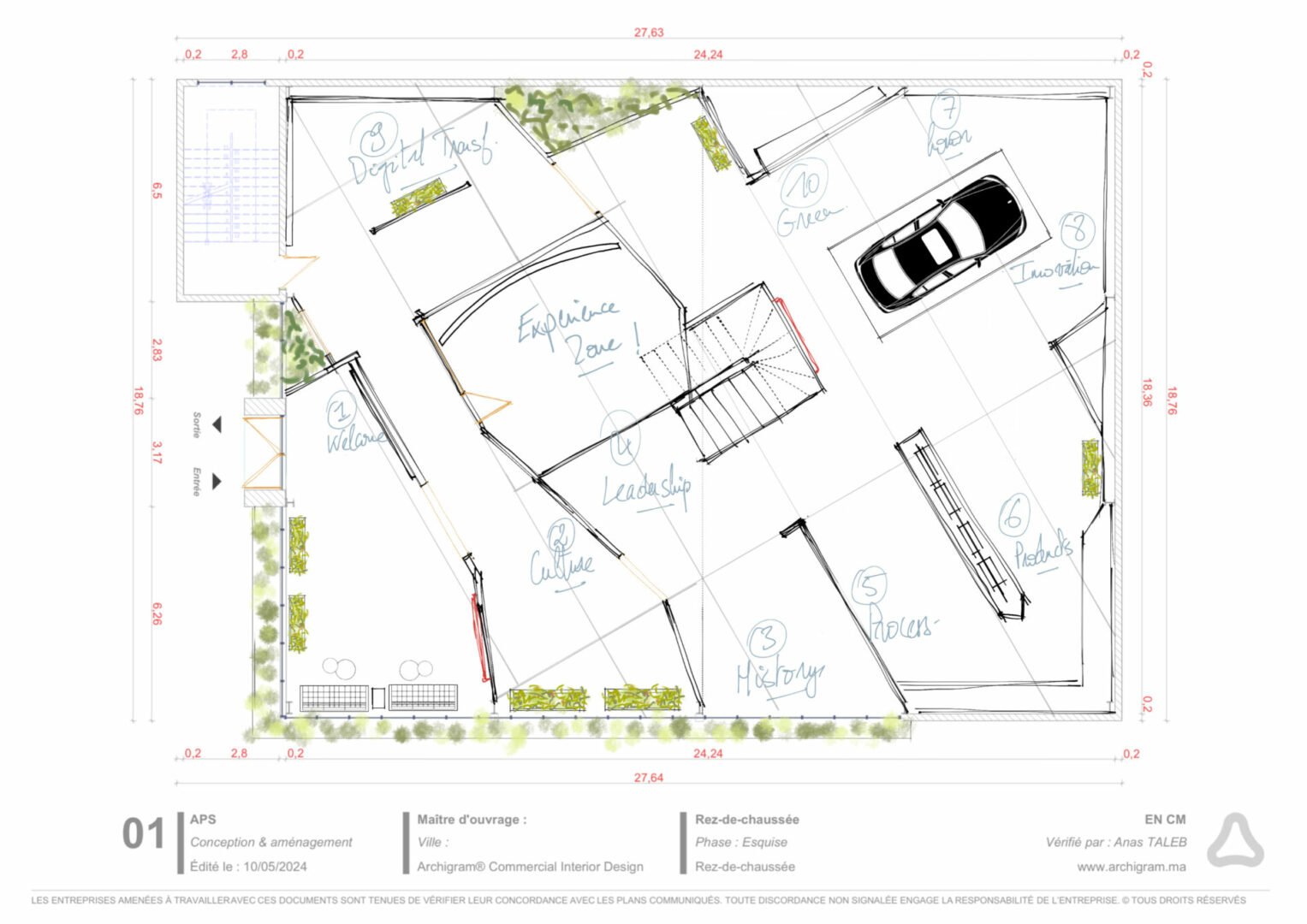 L’espace est structuré autour de plusieurs zones complémentaires : un accueil ouvert et convivial, un espace culturel retraçant l’histoire de DICASTAL, des zones dédiées au leadership, à la transformation digitale, à l’innovation et à la présentation des produits, ainsi qu’un espace vert qui introduit la nature au cœur du design. Chaque zone dialogue visuellement avec la suivante pour offrir une visite fluide et progressive.