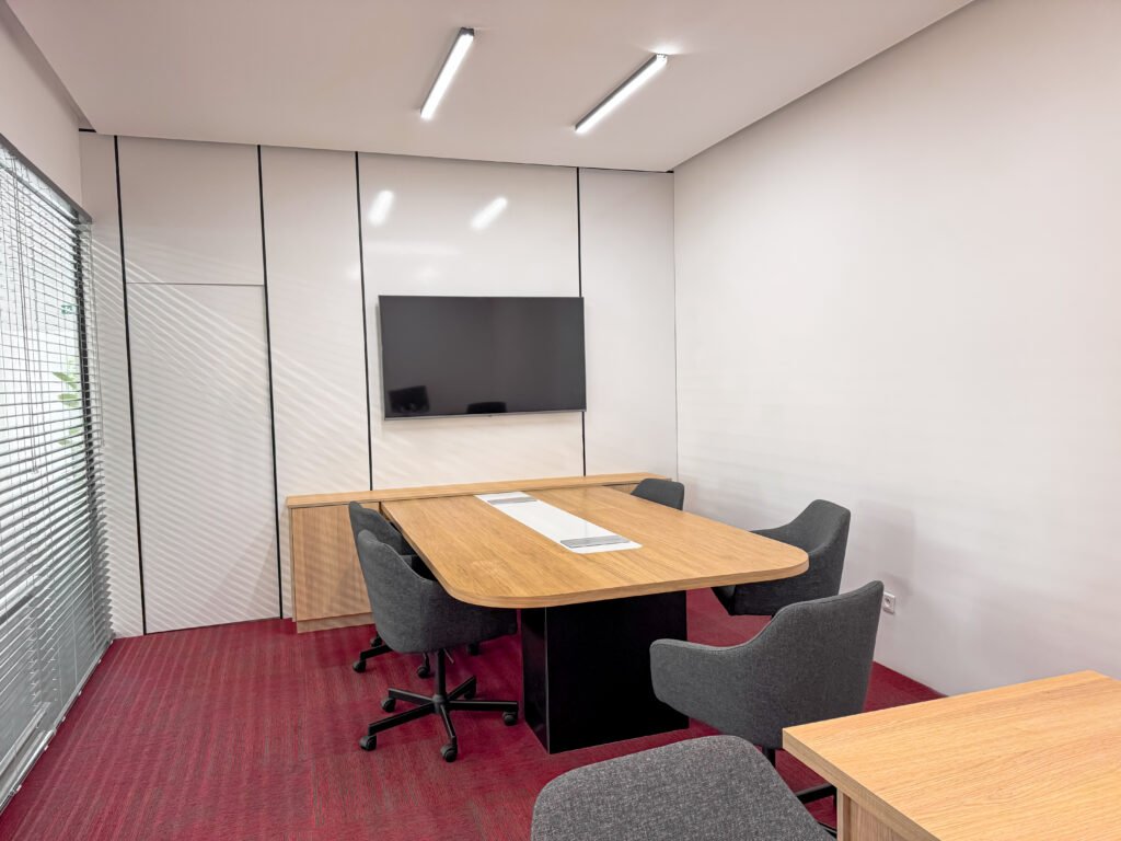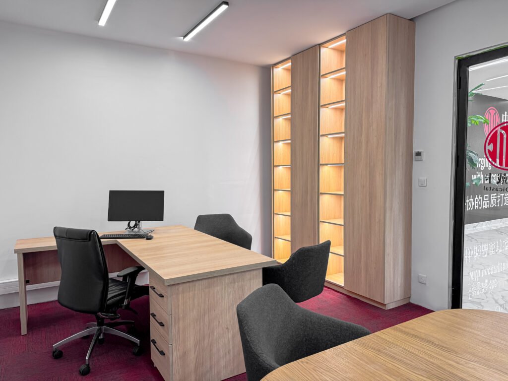 Le mobilier a été conçu sur mesure et intégré selon le plan de zonage. Son caractère modulable permet d’adapter facilement la configuration des espaces, qu’il s’agisse de zones d’exposition, de réunion ou de présentation. Cette flexibilité renforce la dimension dynamique du showroom.