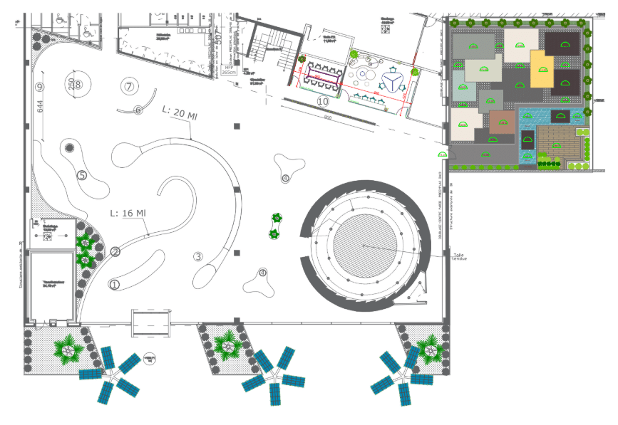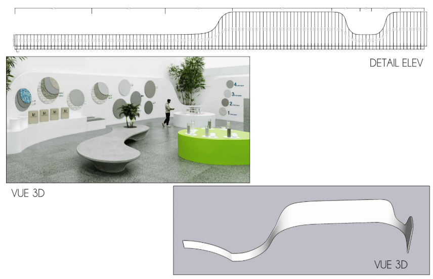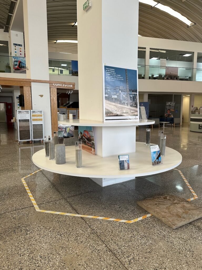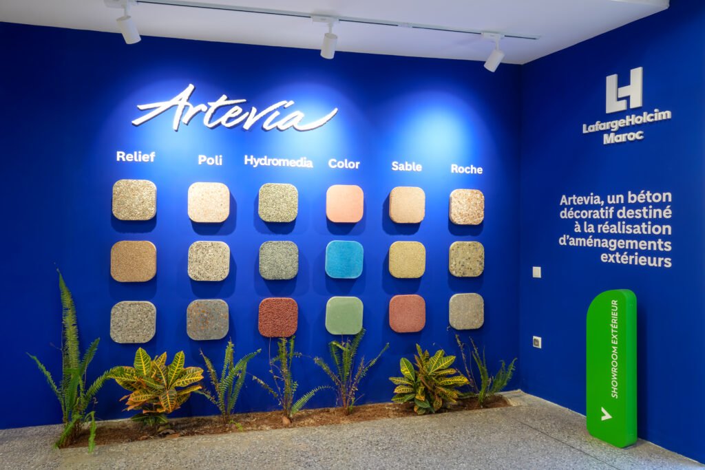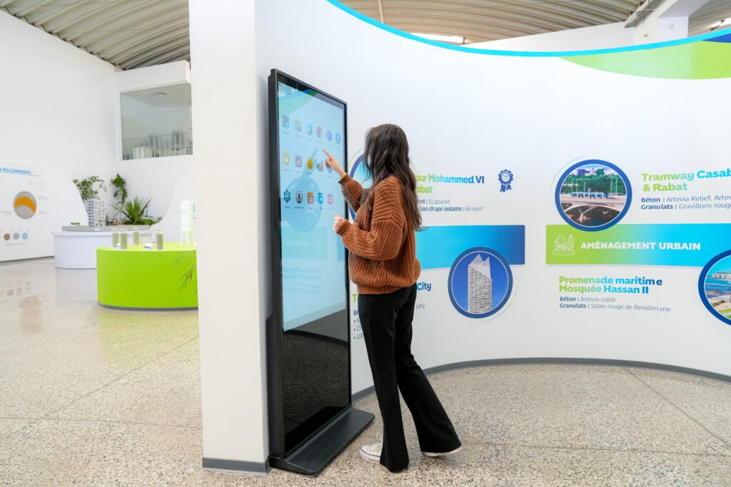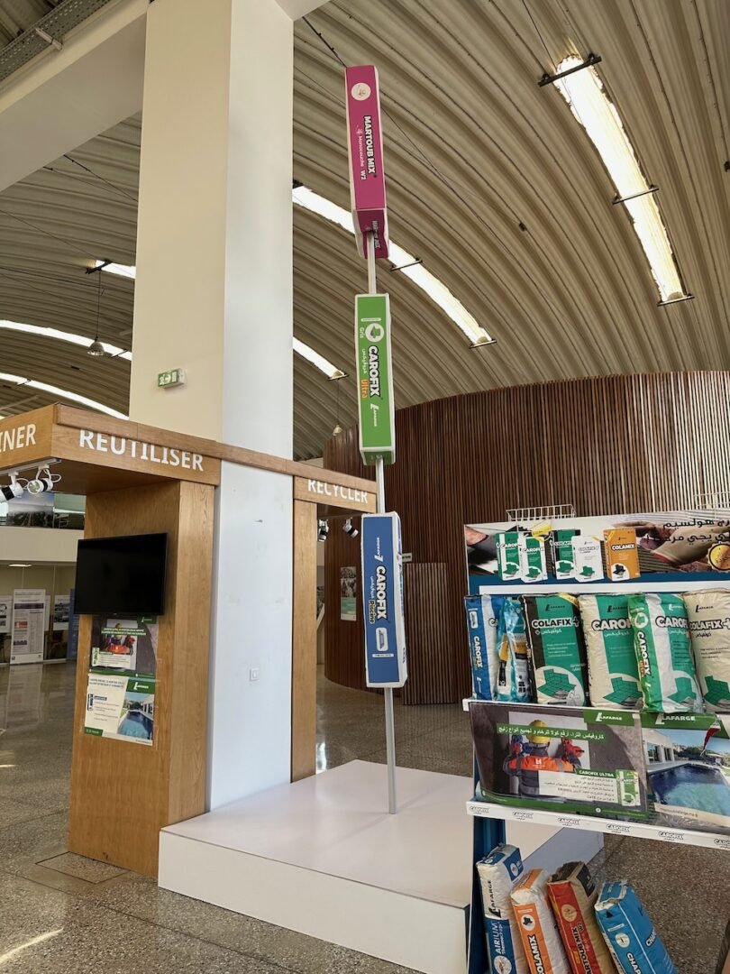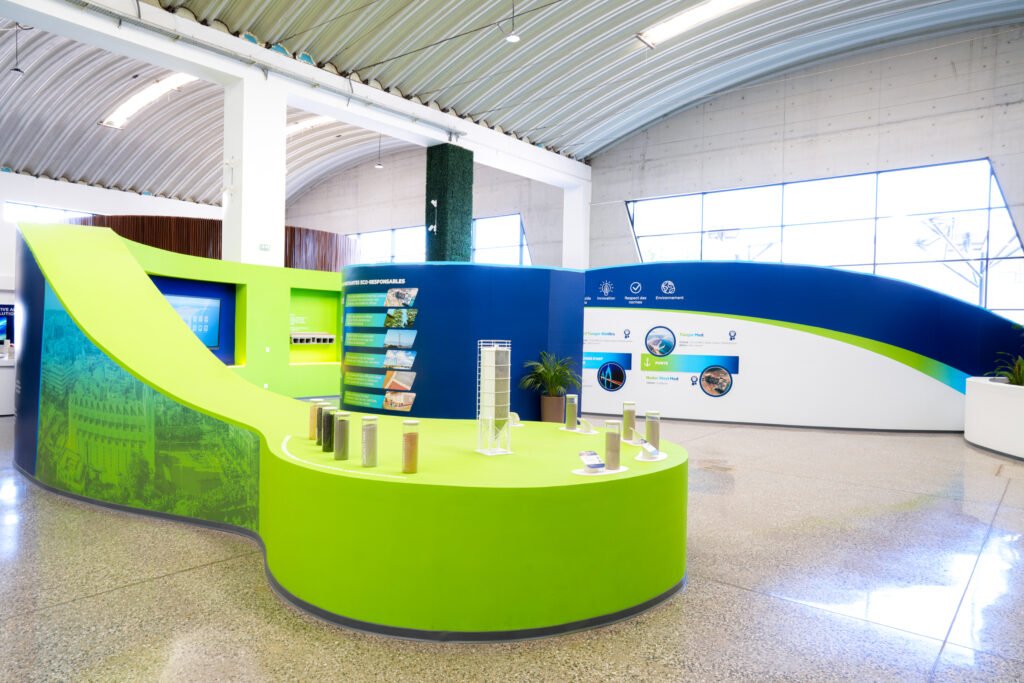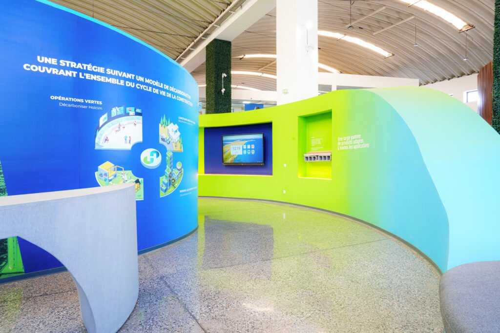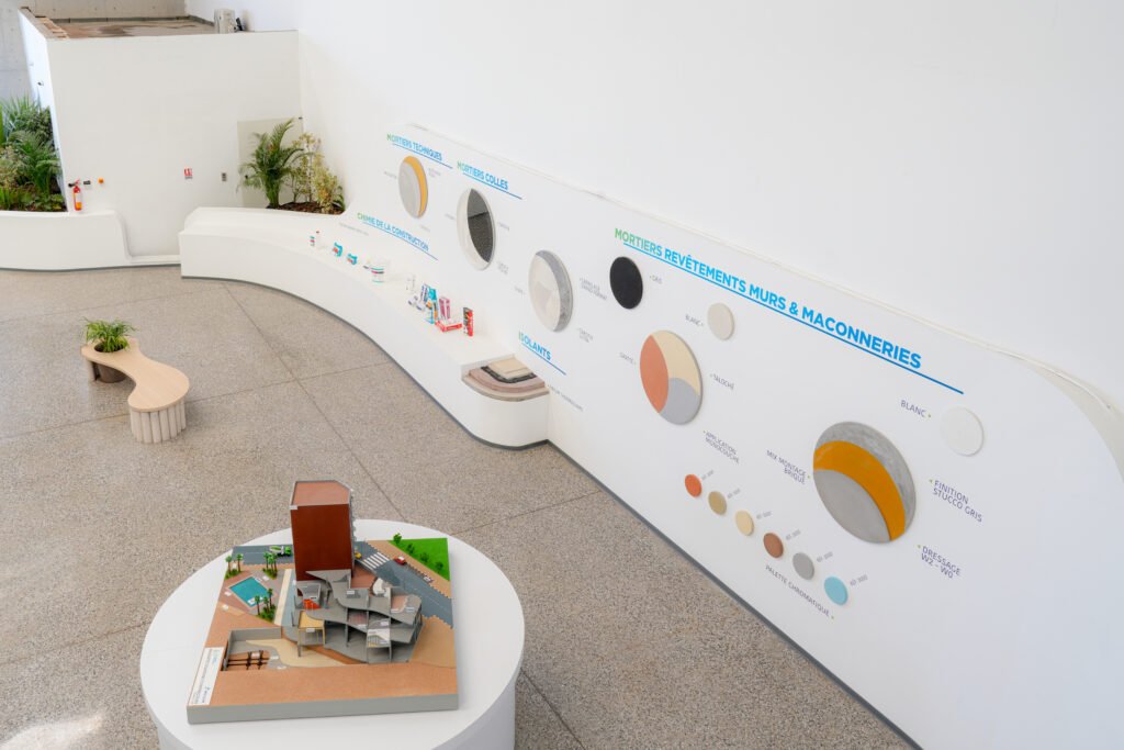 L’aménagement intérieur a été pensé comme un parcours immersif. Dès l’entrée, le visiteur découvre une installation symbolique alliant végétal et technologie, exprimant la fusion entre nature et innovation. À l’intérieur, le showroom est organisé par typologie de solutions (bétons, mortiers, routes, hydromédia, etc.), permettant une compréhension intuitive des produits et de leurs applications.