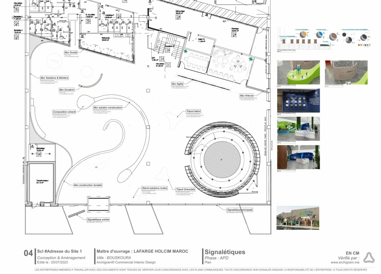 Le cabinet Archigram a développé une approche conceptuelle centrée sur la création d’un espace intelligent, modulaire et expérientiel, à l’image des ambitions du Smart Construction Lab. La conception repose sur une lecture claire des flux, une cohérence esthétique inspirée de la marque Lafarge Holcim, et une utilisation stratégique des matériaux innovants issus même de l’activité du groupe.