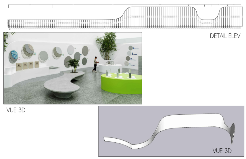 L’aménagement intérieur a été pensé comme un parcours immersif. Dès l’entrée, le visiteur découvre une installation symbolique alliant végétal et technologie, exprimant la fusion entre nature et innovation. À l’intérieur, le showroom est organisé par typologie de solutions (bétons, mortiers, routes, hydromédia, etc.), permettant une compréhension intuitive des produits et de leurs applications.